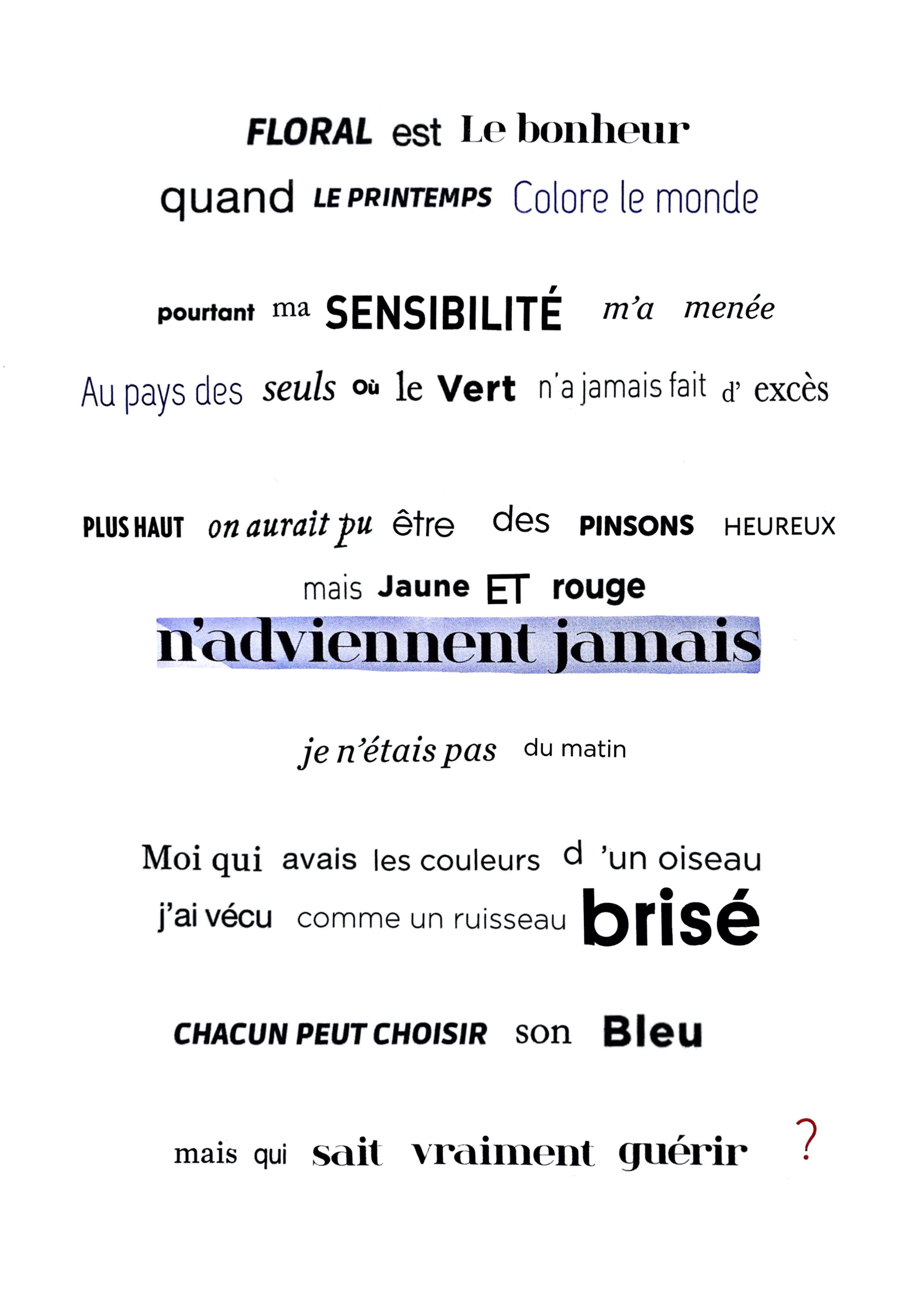 les saisons est une série de poèmes-collés réalisée à partir du découpage de magazines de psychologie positive et de développement personnel. c’est la première fois que j’utilise une source de composition unique et strictement délimitée, dont le choix est né d’une question : est-il possible d’écrire sur des thématiques graves – la maladie, le deuil, l’effondrement – à partir de revues exaltant un mieux perpétuel ? ou qu’est-ce que ça veut dire aller bien ? ou comment dire ça va pas avec des revues où « tout est ok » ? ou ça fait quoi d’habiter dans un monde qui va mal en prétendant le contraire ?