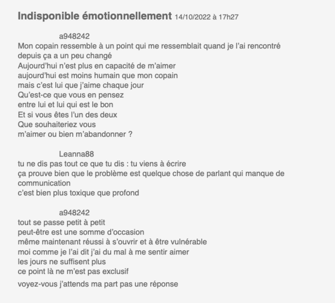 collage – discussion issue du forum « Relations amoureuses » du site Doctossimo devenue vidéo-poème (octobre 22 – en cours)