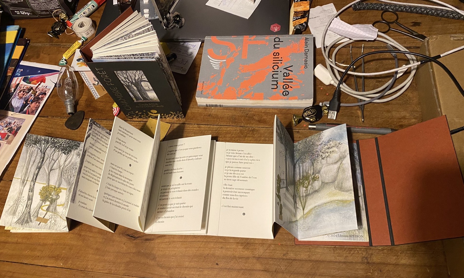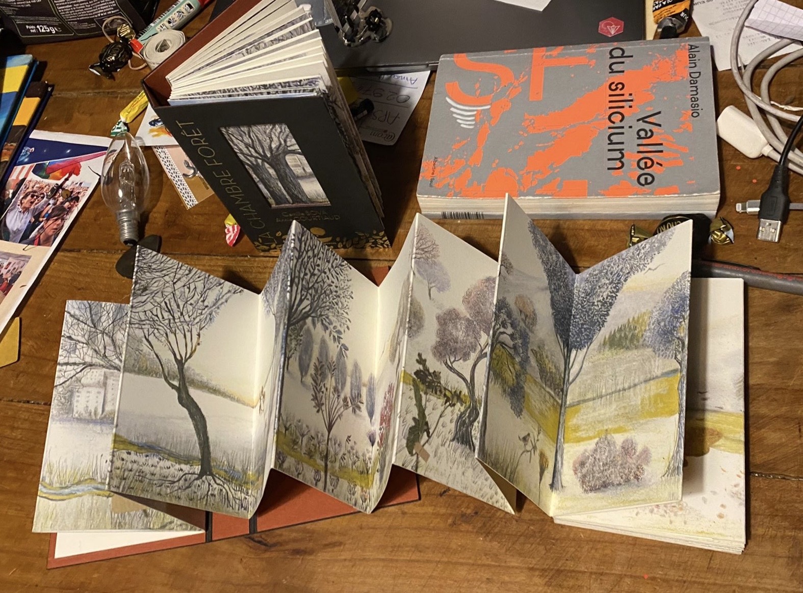 à la fin du mois dernier (c’est-à-dire en novembre 2024), un drôle d’objet a vu le jour : un livre accordéon très beau dont j’ai l’honneur de signer le texte, accompagné par des dessins d’Annie Courtiaud.
