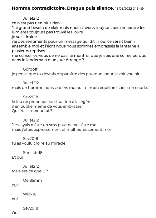 ce n’est ni ma peau ni mes ongles. ce sont des discussions volées dans la rubrique « relations amoureuses » du forum de doctissimo. je conserve le titre du « topic » et le nom des postants.