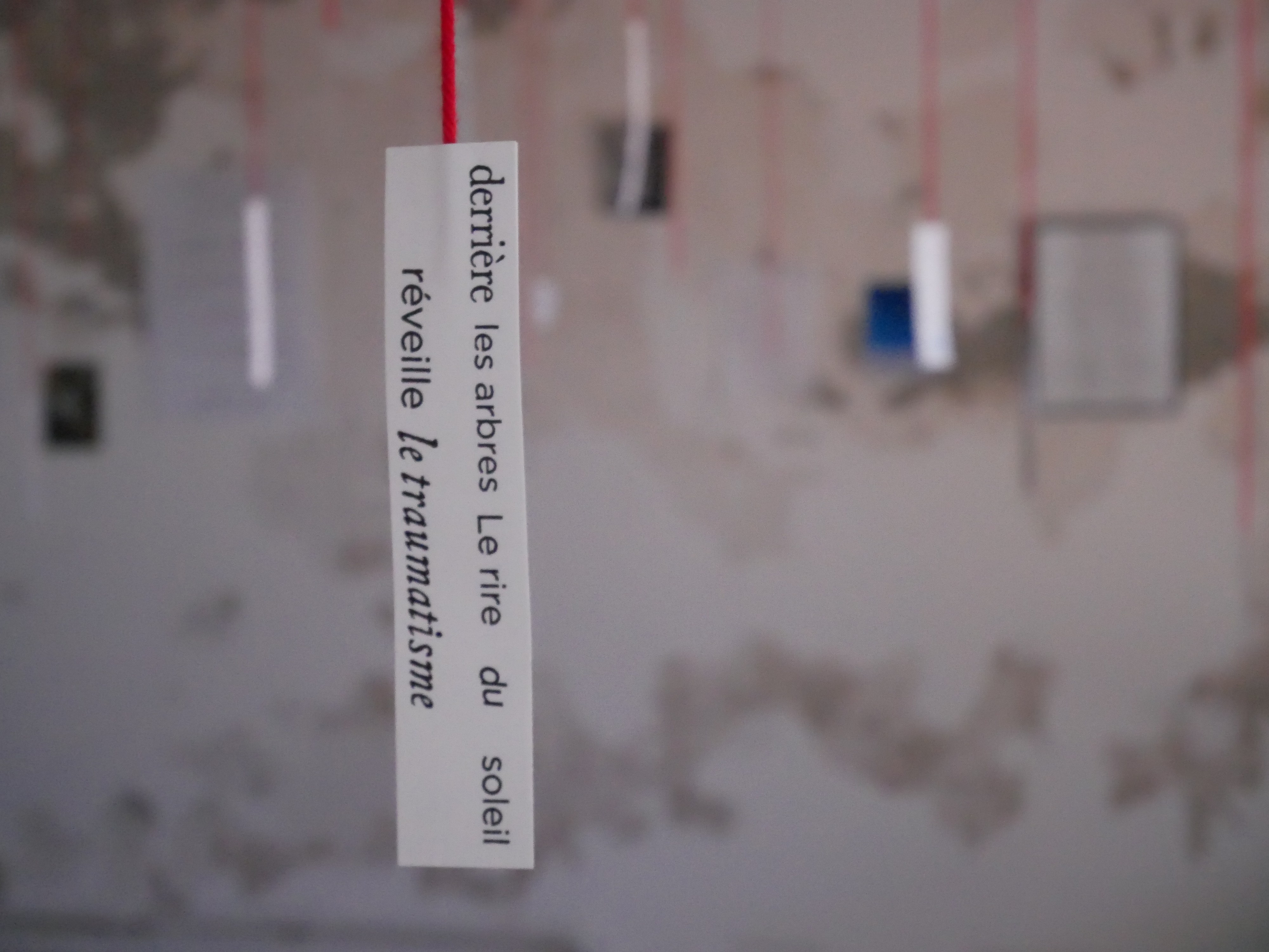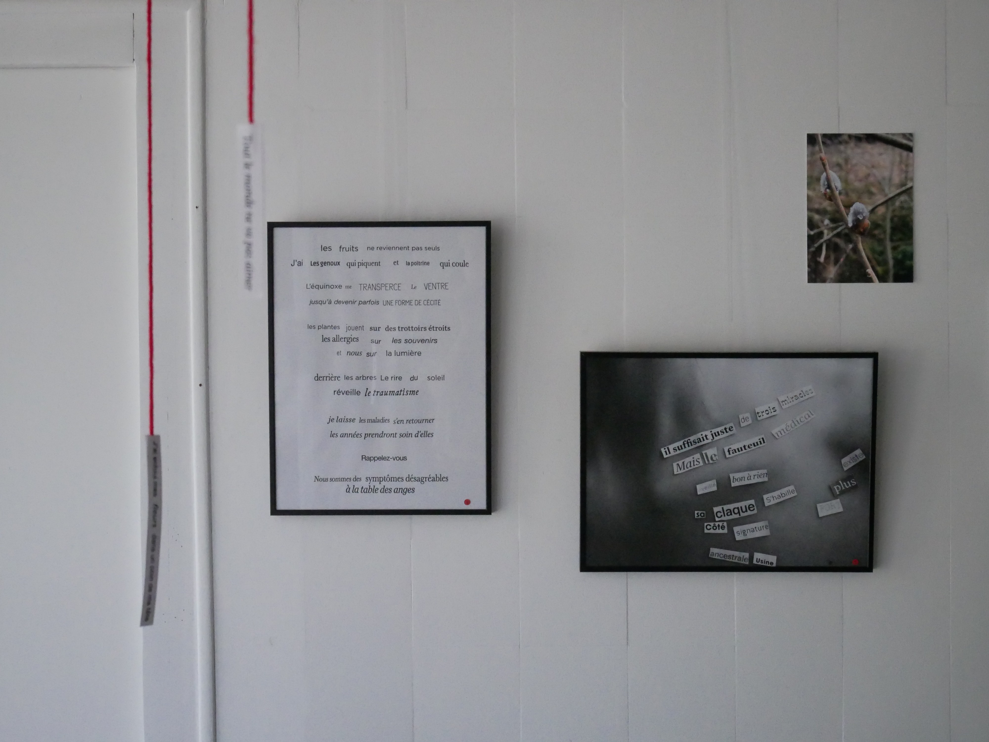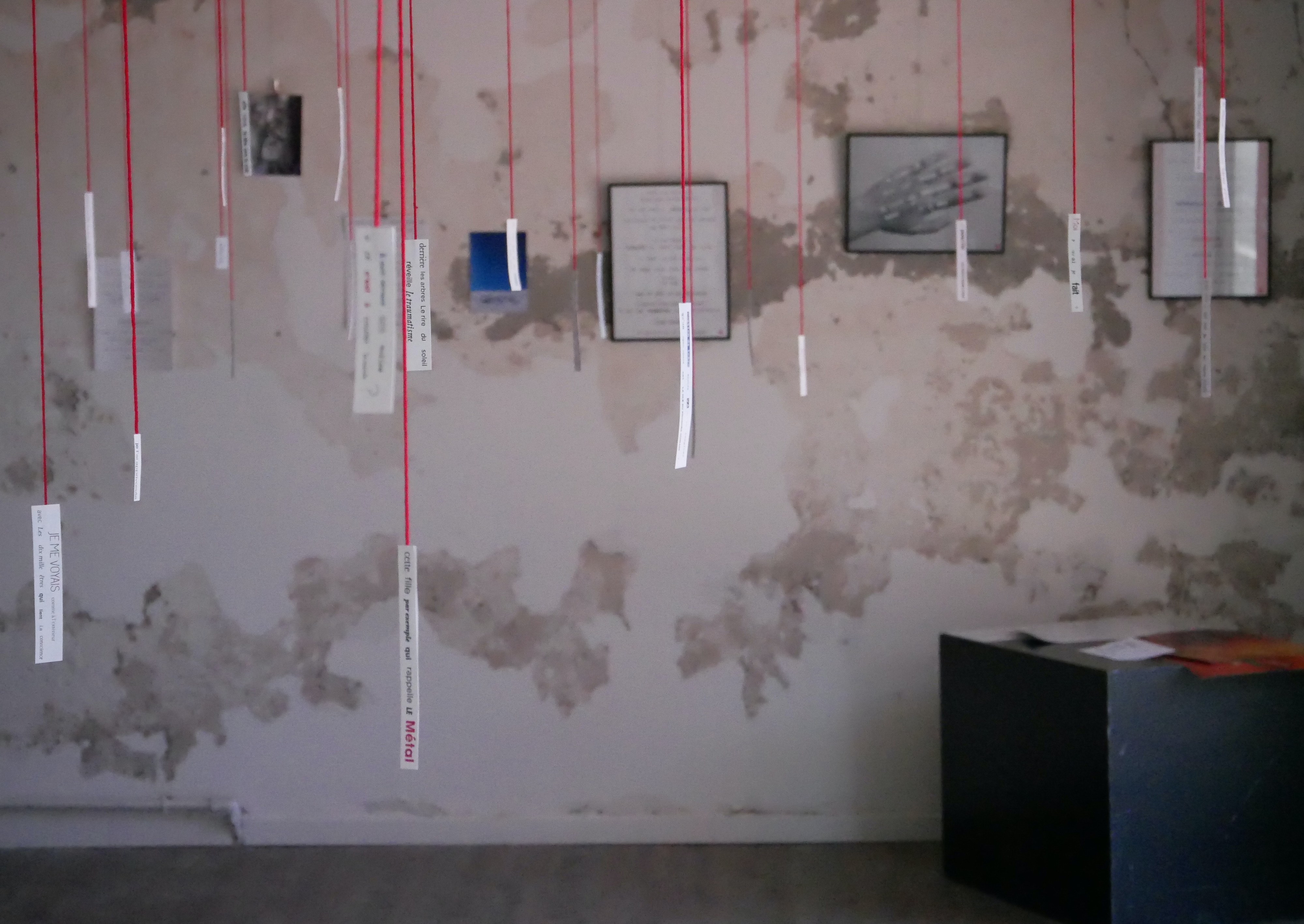 L’exposition comprend aussi une série photographique intitulée Autopsie, différentes vidéo-poèmes à regarder et à écouter et encore d’autres poèmes ; le tissage des différents éléments entre eux est assuré par une installation sur l’ensemble de l’exposition.