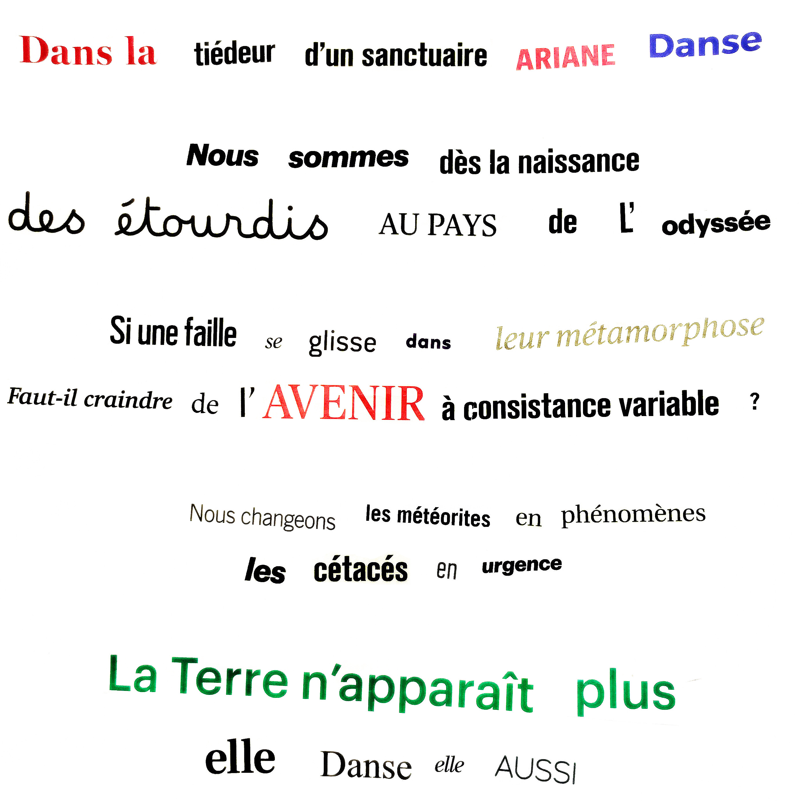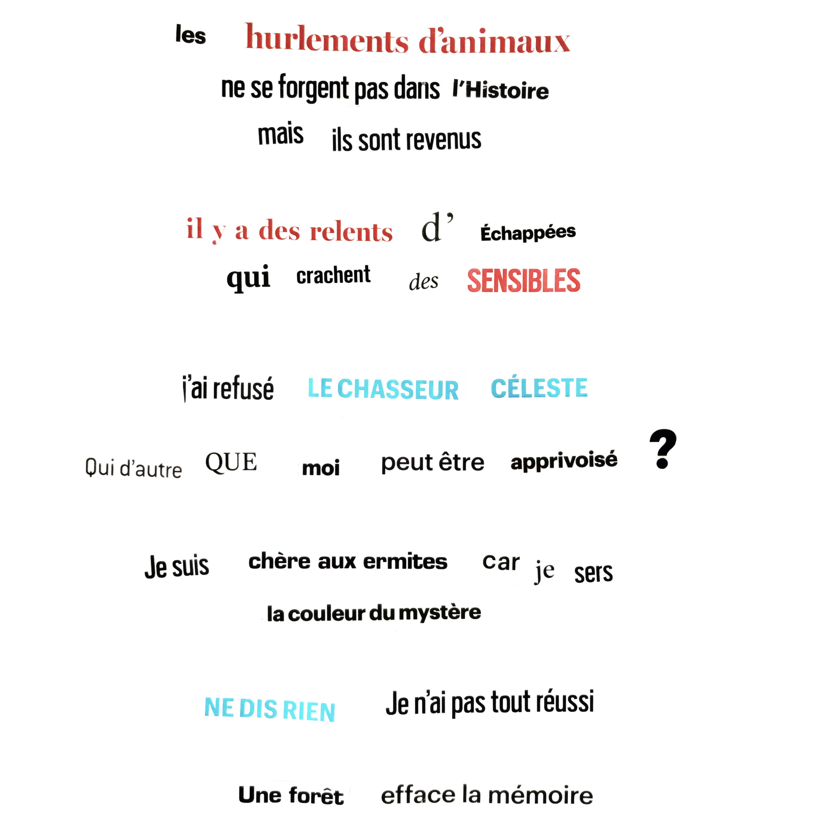 Finalement, du monde du dedans au monde du dehors, tout est affaire de collage – des poussières d’étoiles et voilà des humains, des nuées d’humains et voilà des problèmes. Alors plutôt que de s’évertuer à être des tonneaux remplis de nous-mêmes, coller c’est parfois se dire qu’on peut inventer de nouvelles façons d’être – loup arbre ou visages mais aussi phacochère ou bien vent ou aurore – qui seront comme des mots que la terre pourra recoller à loisir pour s’en faire des chapeaux quand il fera trop chaud. »